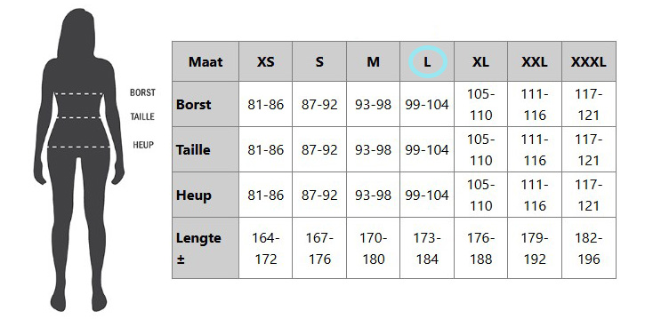 Deze body heeft de maat L. De daarbij behordende borst, taille en heupomtrekken vindt u in onderstaande tabel. Op zoek naar een andere maat? Neem contact op met onze klantenservice.